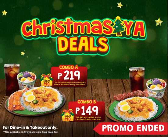 - Combo A – Chicken Inasal + Palabok + Drink + 8oz Extra Creamy Halo-Halo for ₱219