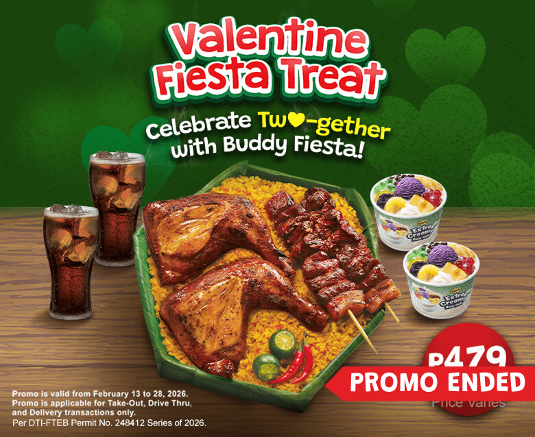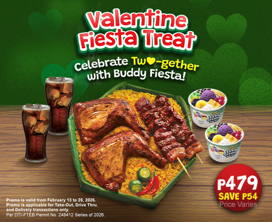 A complete and affordable bundle perfect for couples, families, or friends. Enjoy Chicken Inasal, Pork BBQ, Extra Creamy Halo-Halo, and drinks for only ₱479. This is available for takeout, drive-thru, and delivery from February 13-28, 2026.